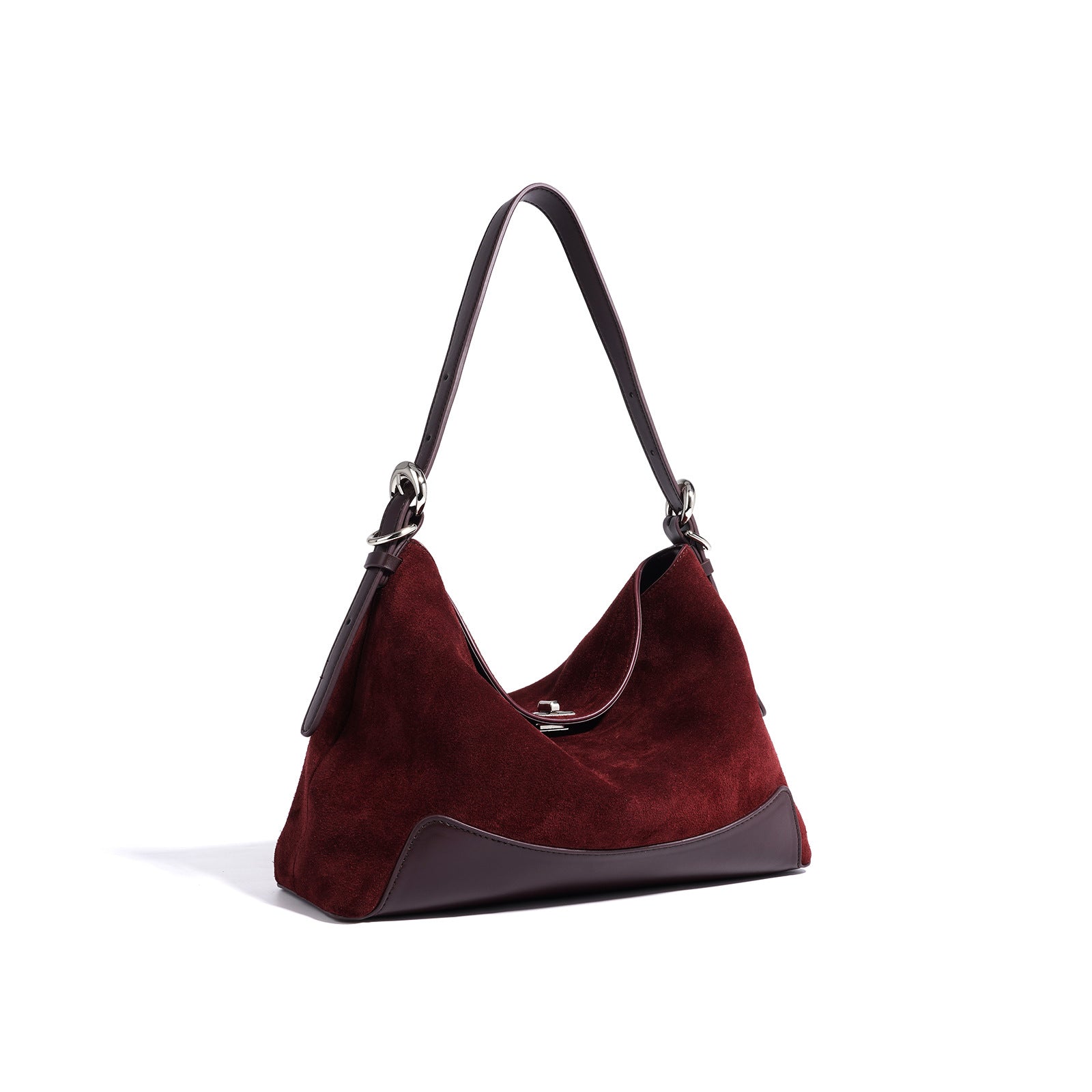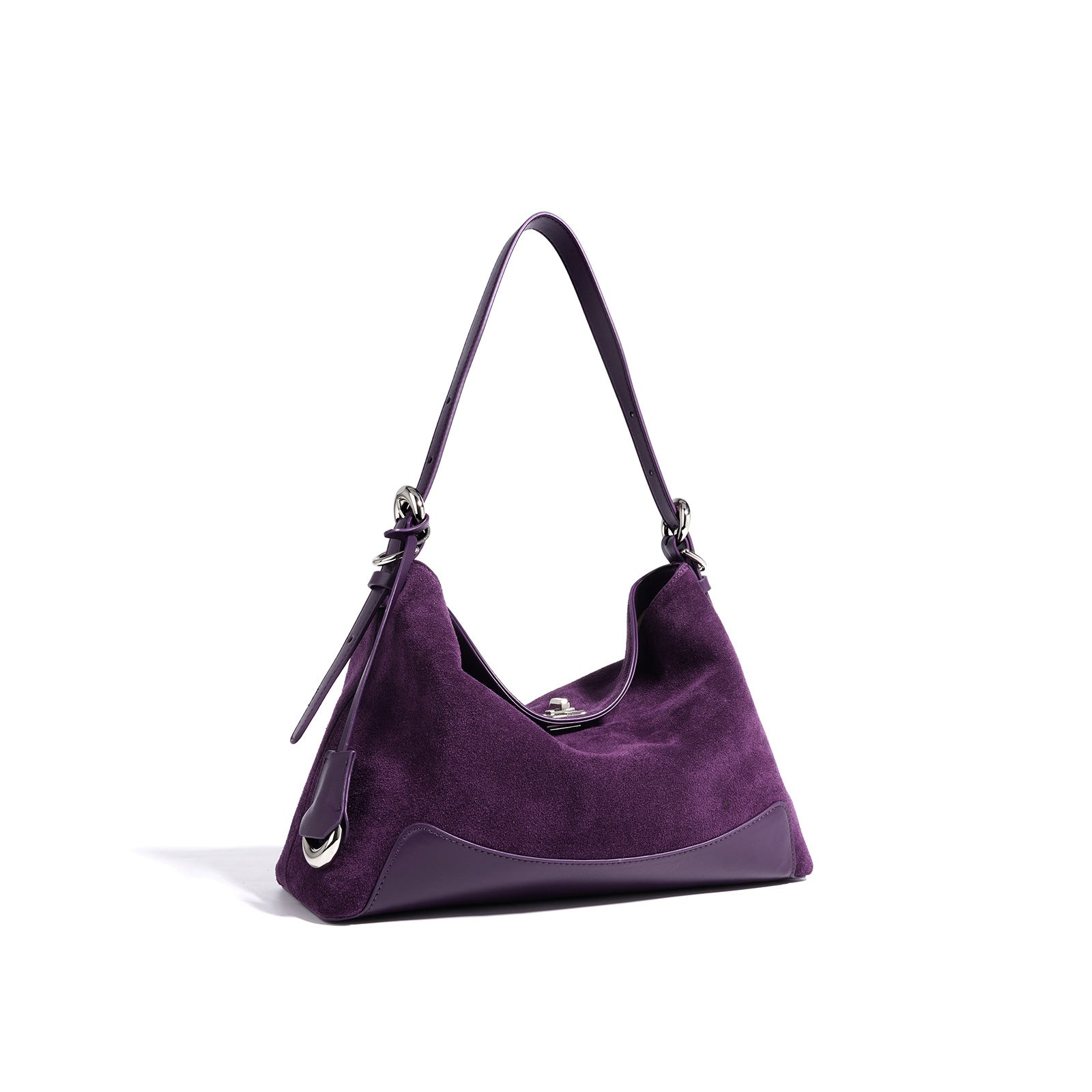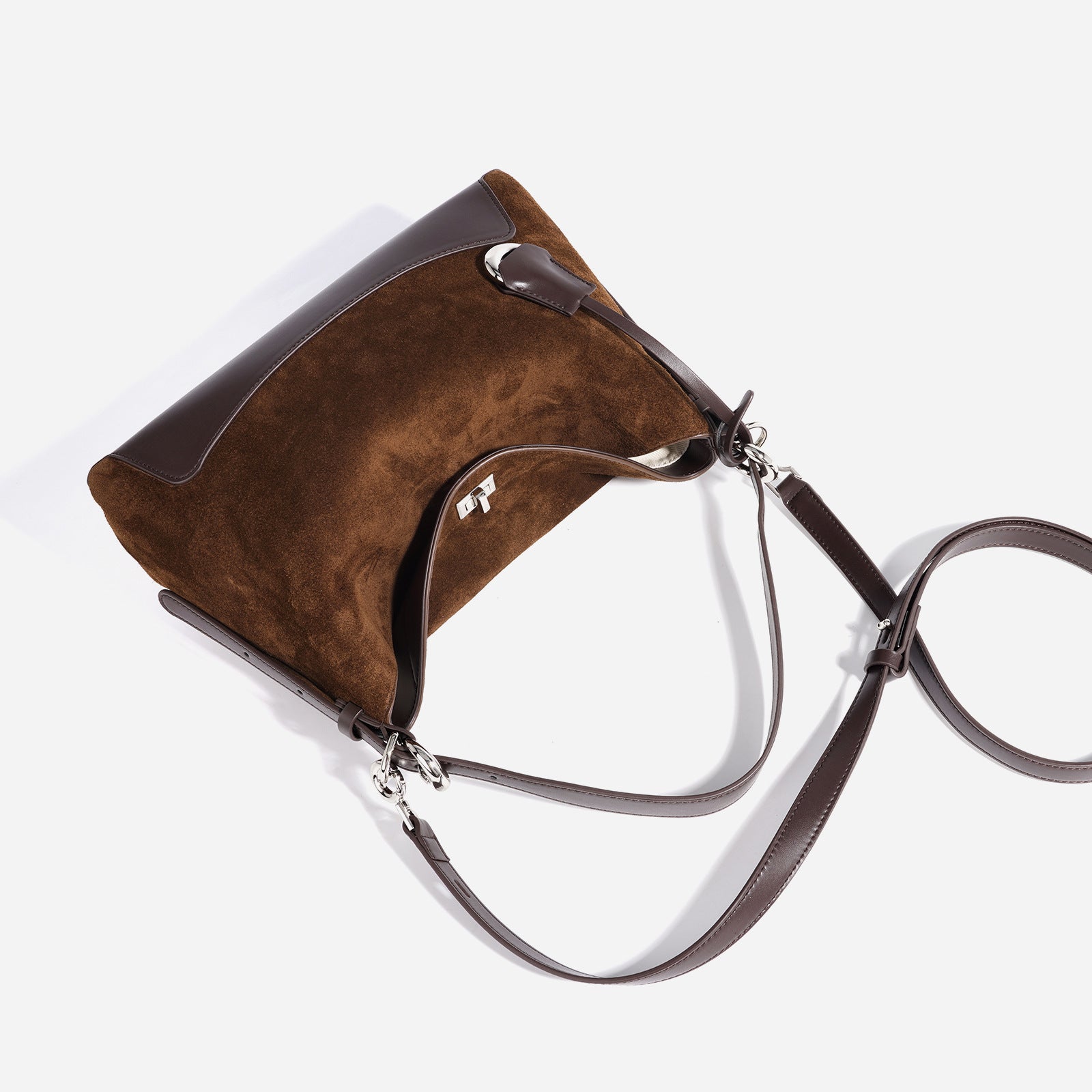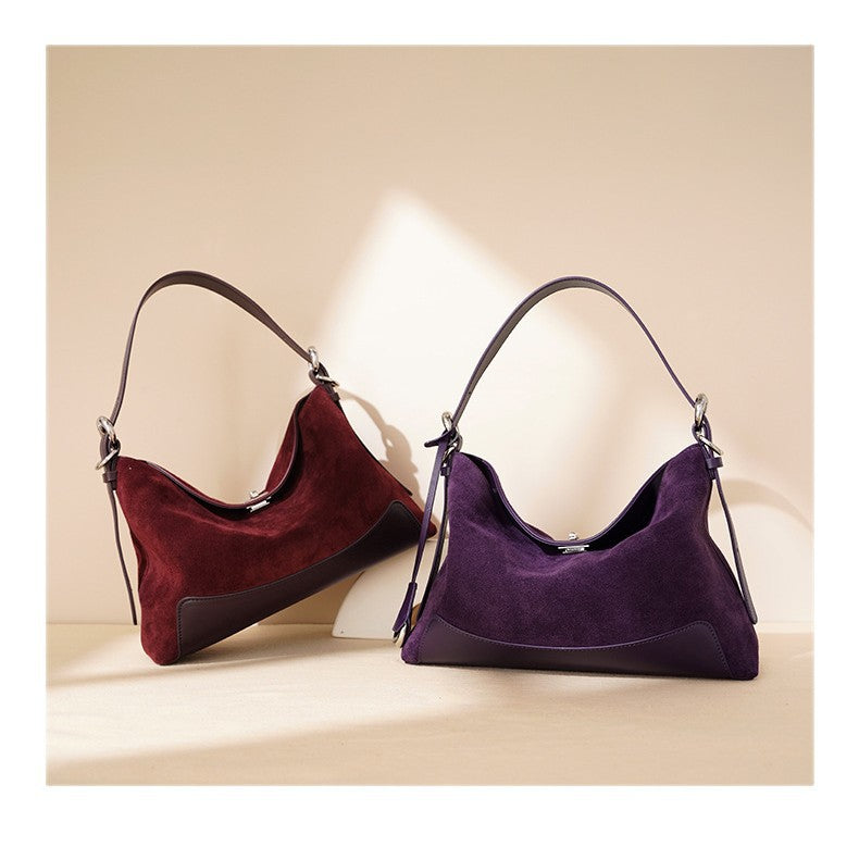 diese edle handtasche aus wildleder kombiniert luxuriöse textur mit moderner formgebung. das harmonische zusammenspiel von mattem wildleder und glänzenden lederdetails sorgt für ein raffiniertes finish. ideal für den alltag und besondere anlässe – ein accessoire, das schlichte eleganz und hochwertige verarbeitung perfekt vereint.