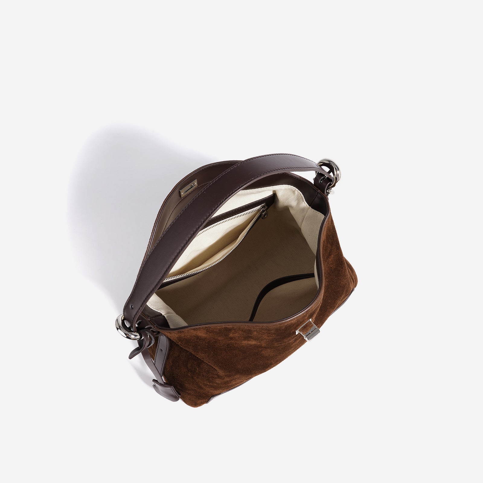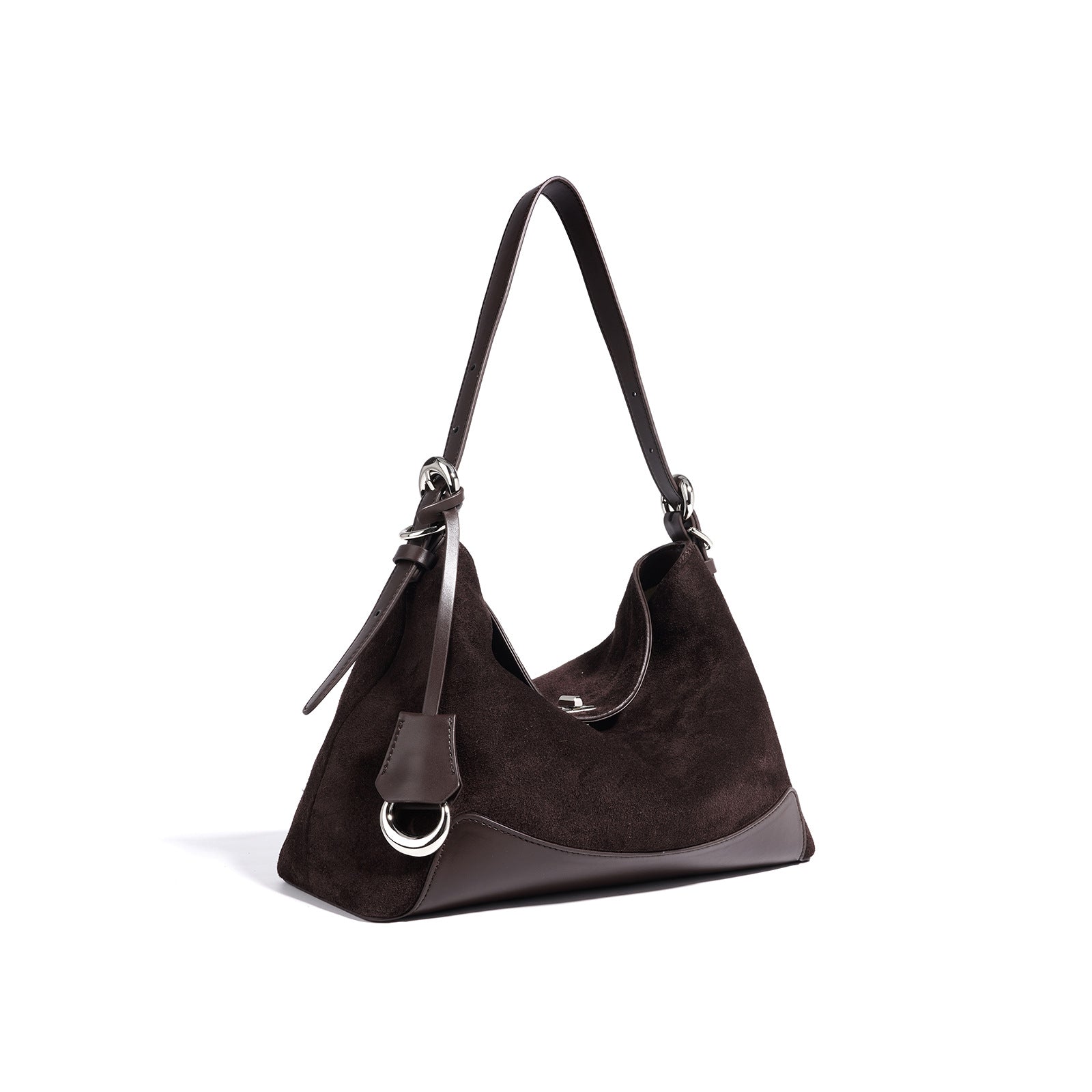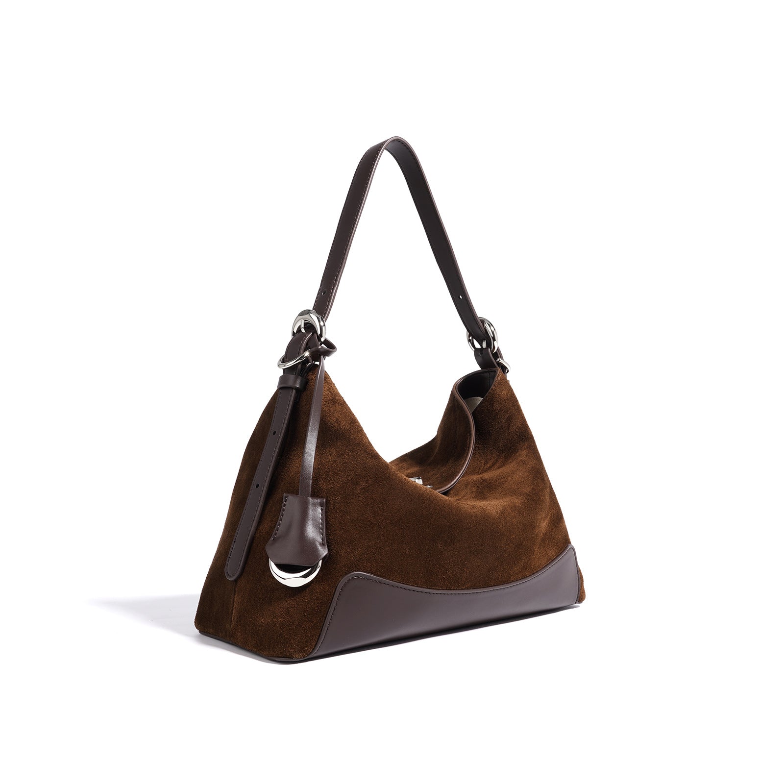 diese edle handtasche aus wildleder kombiniert luxuriöse textur mit moderner formgebung. das harmonische zusammenspiel von mattem wildleder und glänzenden lederdetails sorgt für ein raffiniertes finish. ideal für den alltag und besondere anlässe – ein accessoire, das schlichte eleganz und hochwertige verarbeitung perfekt vereint.
