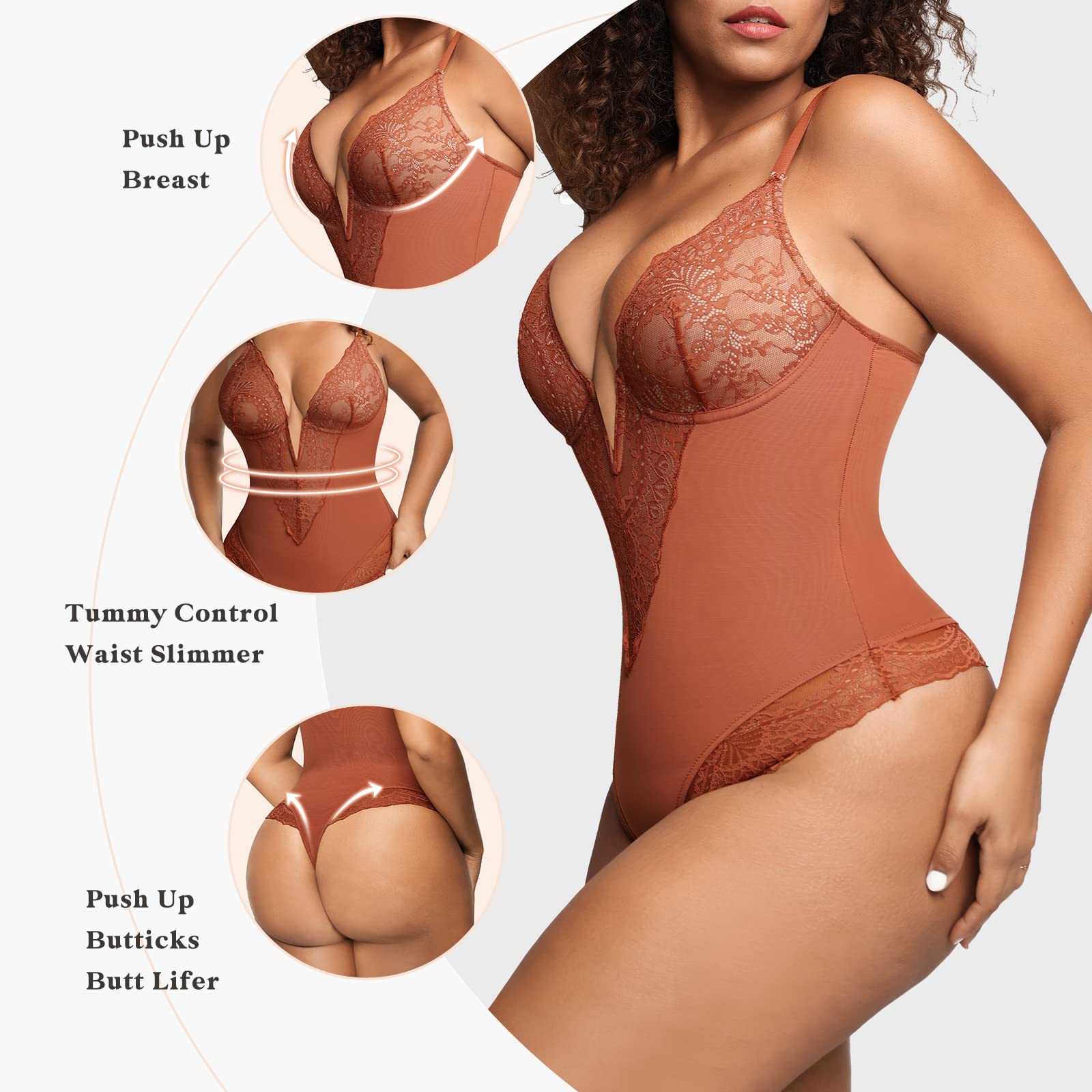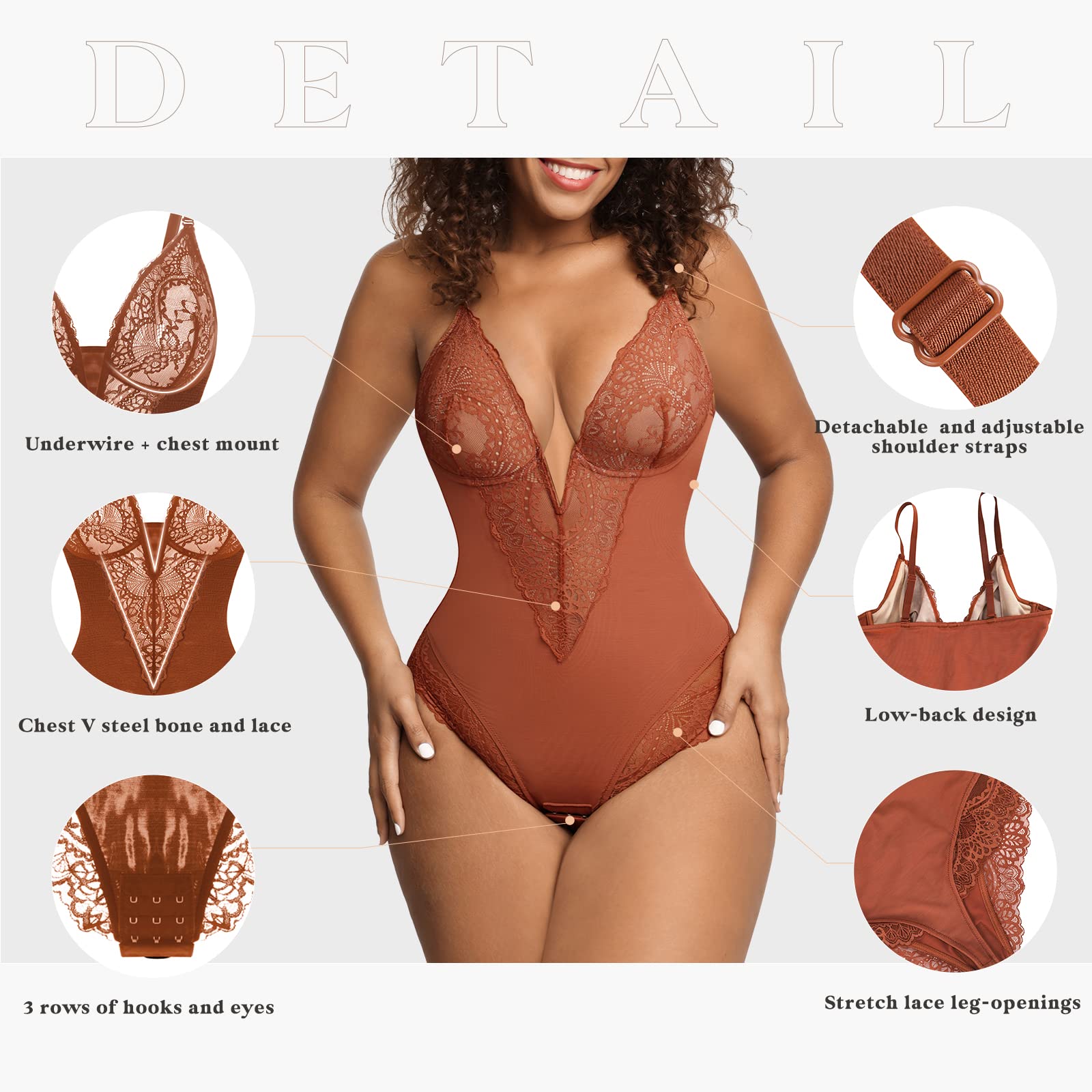 Deep-V-Ausschnitt Detail und zarter Spitzen-Bodysuit.