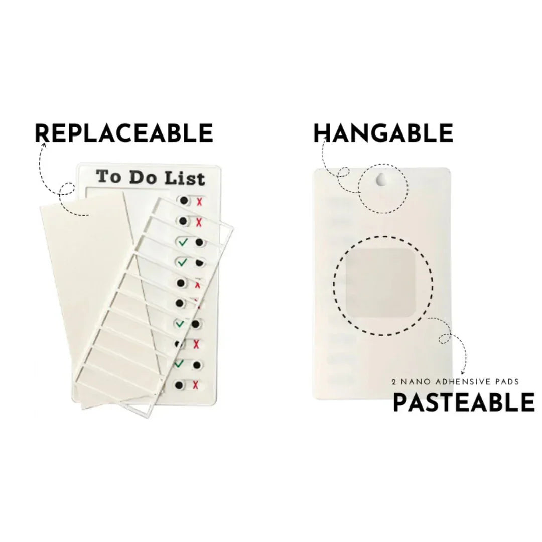 Hängen Sie die Checkliste an die Wand oder verwenden Sie das mitgelieferte doppelseitige Klebeband, um sie überall anzubringen! Bringen Sie sie in der Nähe der Haustür an, um sicherzustellen, dass alles erledigt wird, bevor Sie das Haus verlassen!