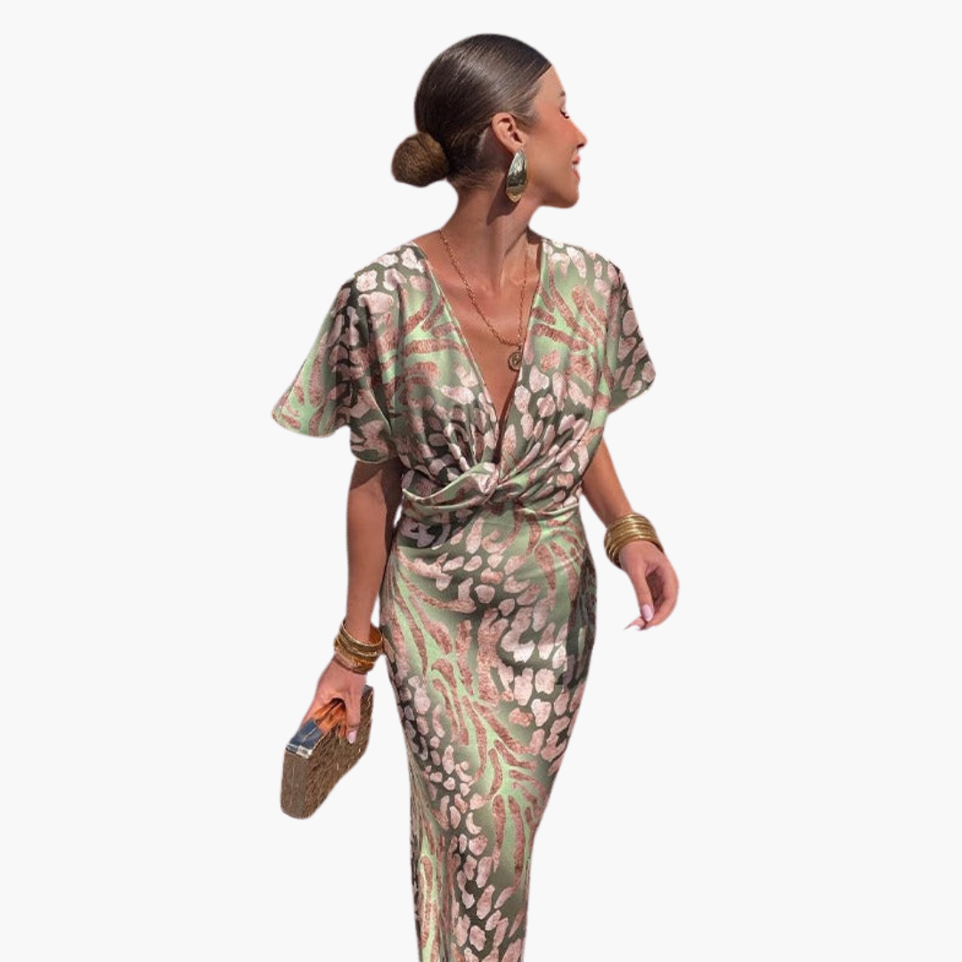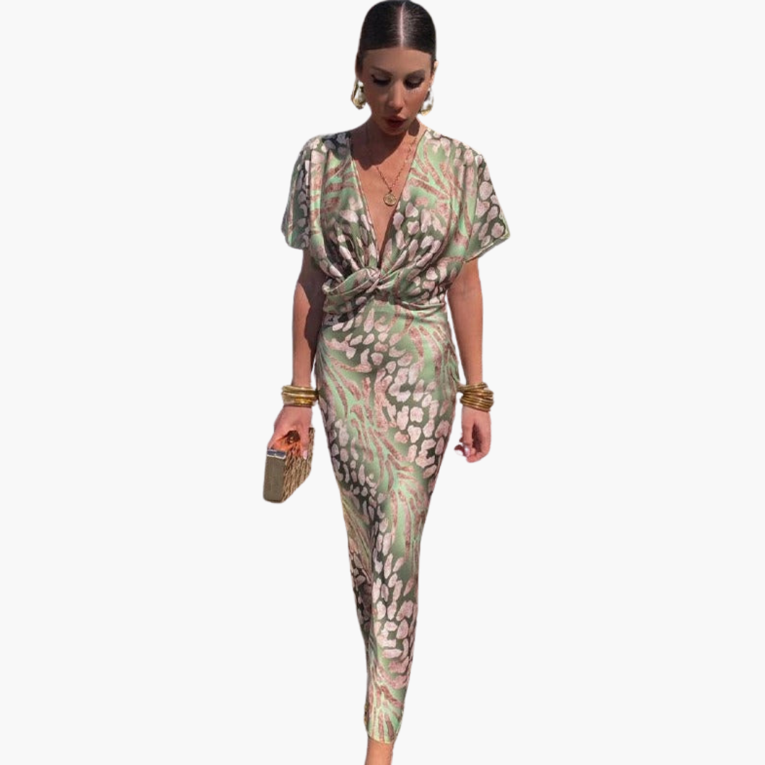 Leichtes Damenkleid für den ganzjährigen Gebrauch. Es verfügt über einen tiefen V-Ausschnitt, kurze Ärmel und einen knöchellangen Schnitt. Das geknotete Front-Detail verleiht dem figurbetonten Design eine elegante Note. Ideal für verschiedene Anlässe, bietet dieses Kleid eine graziöse Bewegung und einen subtilen Glanz, um bei jedem Event gut auszusehen.