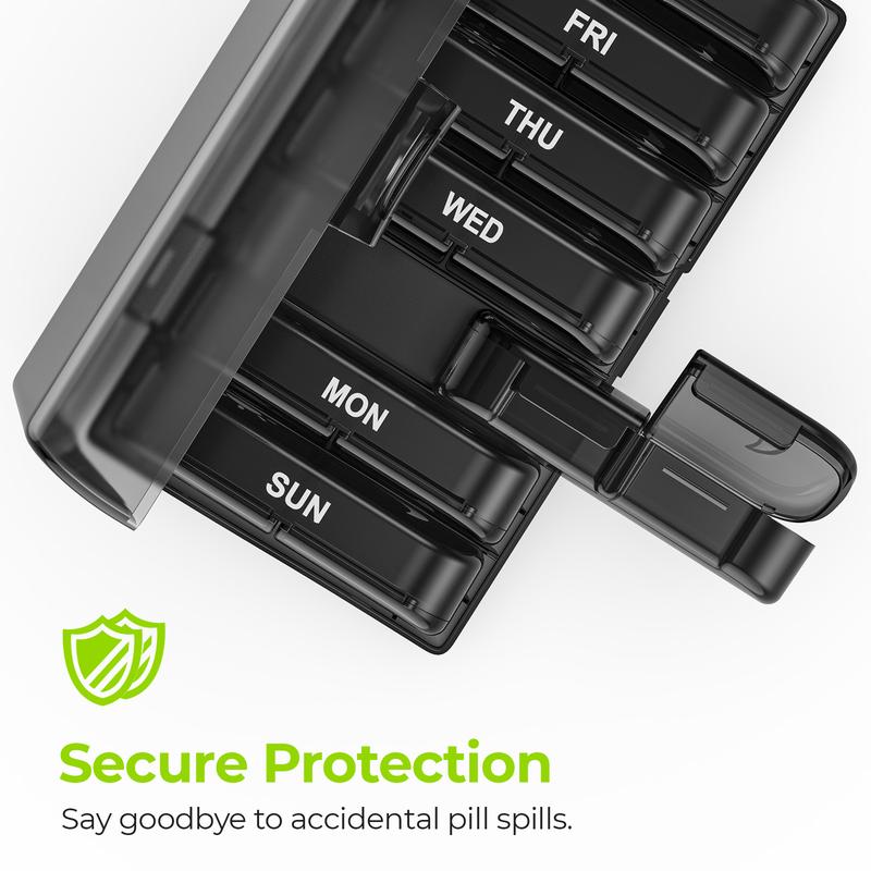 Für den Langzeiteinsatz gebaut, sind das Gehäuse und die Scharniere verstärkt, um 10.000 Anwendungen standzuhalten. Die UV-bedruckten Etiketten bleiben klar und verwischen nicht, sodass Sie Ihre Pillen leicht identifizieren können, ohne sich Gedanken über das Verblassen machen zu müssen.