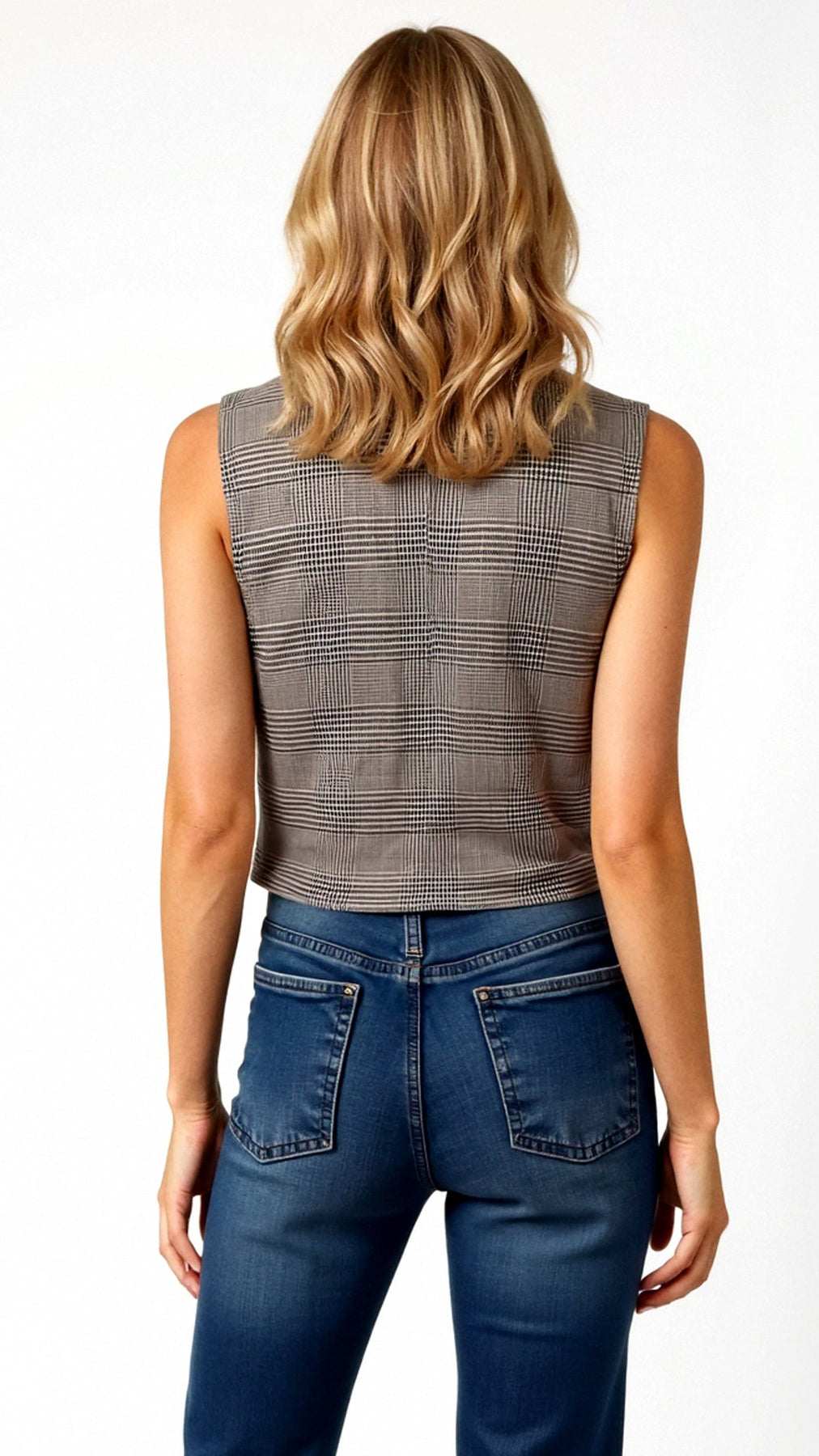 Die Weste „Harmonia“ ist ein raffiniertes Herrenmode-Stück. Dieses maßgeschneiderte Schmuckstück besticht durch klassisches Glencheck-Muster in taillierter Silhouette, während Knöpfe und Pattentaschen im Heritage-Stil für traditionellen Charme sorgen. Der tiefe V-Ausschnitt und der geschwungene Saum verleihen maskuliner Form den perfekten femininen Twist.