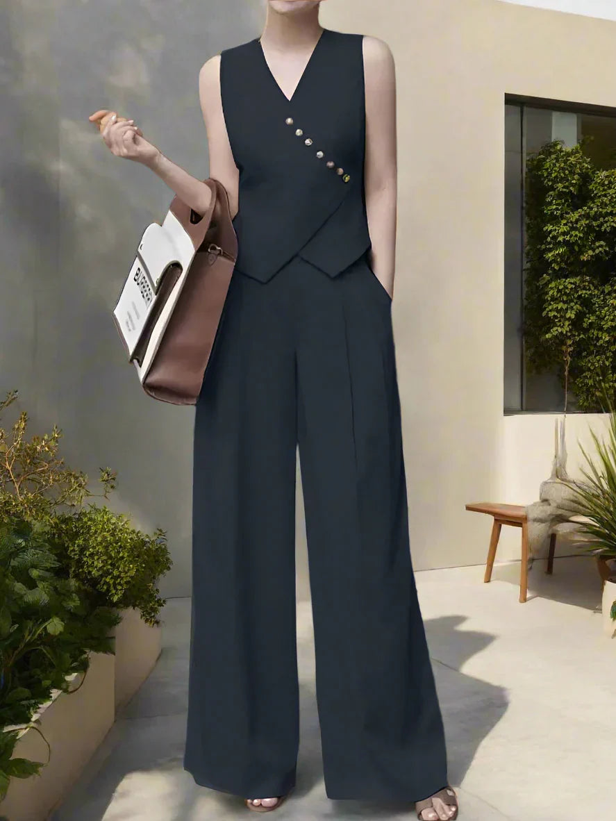Entdecken Sie die perfekte Kombination aus Vintage-Charme und zeitgenössischem Stil mit unserem exquisiten Zweiteiler-Set. Die hochwertige Verarbeitung und der fließende Schnitt schmeicheln jeder Figur, während die weiten Beine für maximale Bewegungsfreiheit sorgen. Ein Ensemble, das sowohl im Büro als auch bei besonderen Anlässen eine elegante Statements setzt.
