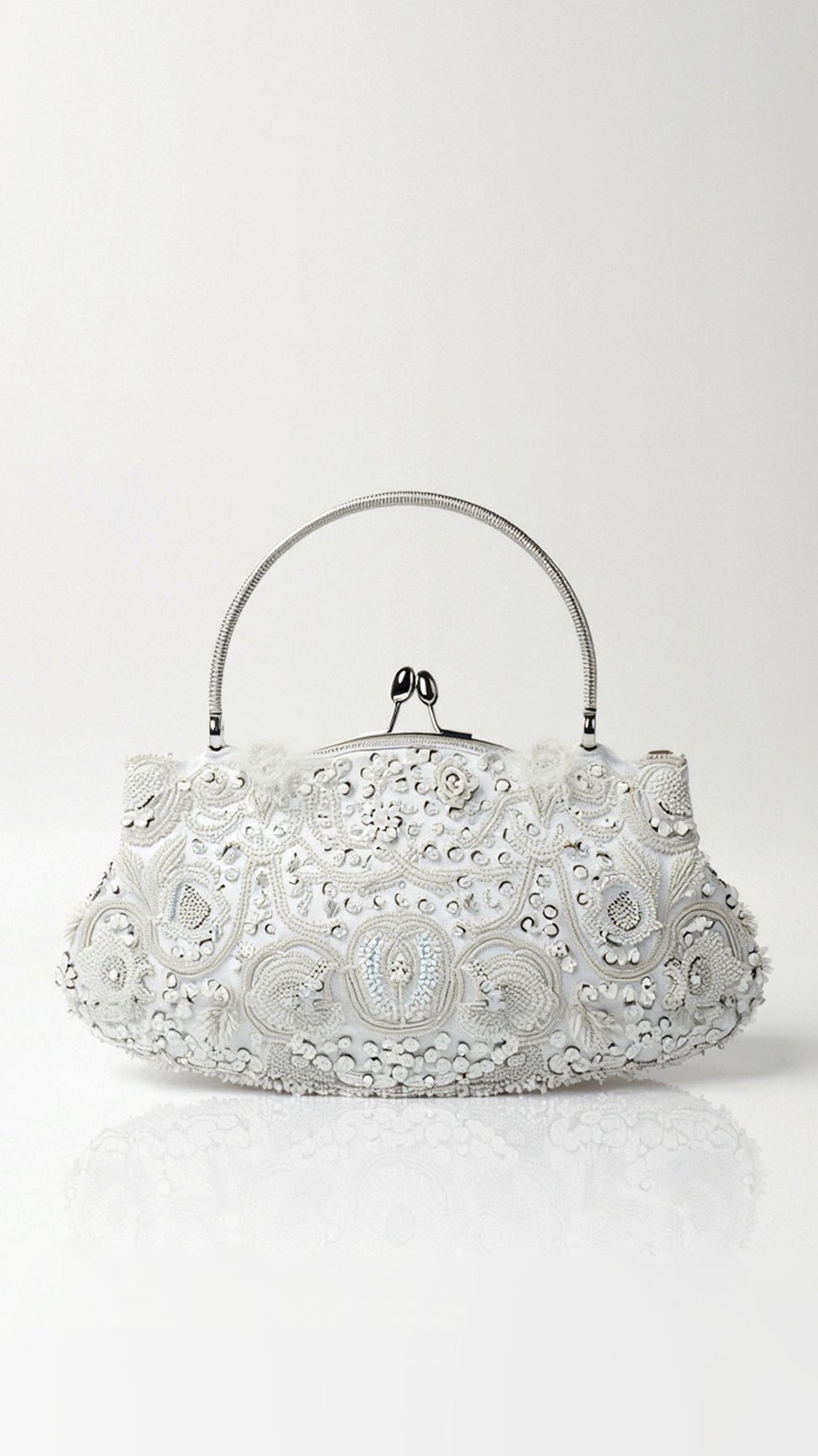 Die Clutch „Eliana“ ist eine Neuinterpretation von Vintage-Romantik. Dieses bezaubernde Abendstück besticht durch aufwendige Perlenstickereien in zartem Rosa, die anmutige Bögen im Art-déco-Stil bilden, die das Licht einfangen und streuen. Der silberfarbene Rahmen und der Kussverschluss verleihen den perfekten Hauch von Glamour der alten Welt.