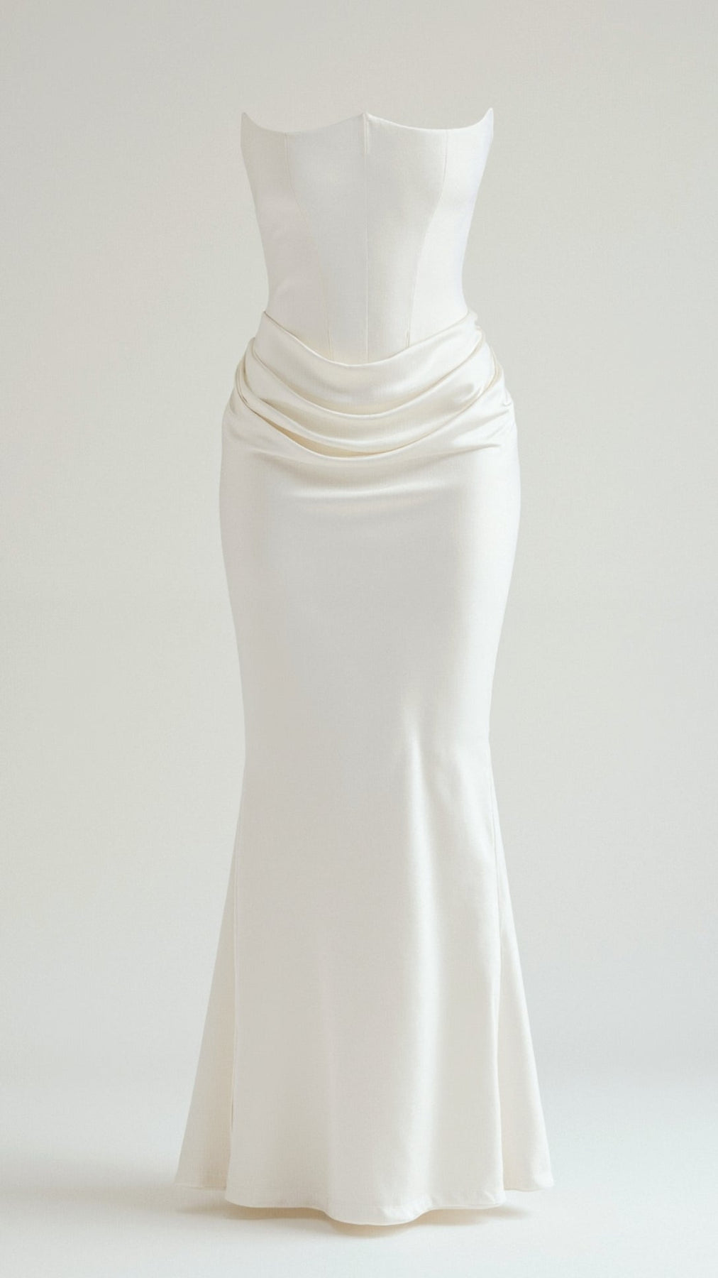 Das „Fiorella“-Kleid ist zeitlose Eleganz in Reinkultur. Dieses bodenlange Meisterwerk besticht durch ein strukturiertes, trägerloses Oberteil, das die perfekte Basis bildet, während kunstvolle Raffungen an der Hüfte beneidenswerte Kurven zaubern. Die taillierte Silhouette geht in einen dezenten Meerjungfrauen-Schlag über, der jeden Schritt zum Leuchten bringt.