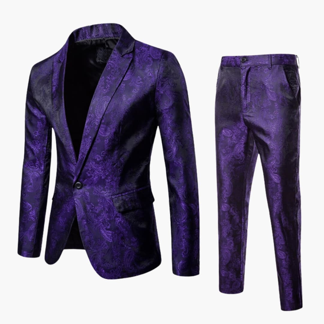 Dieser Herrenanzug besteht aus einem zweiteiligen Set mit Blazer und Hose. Aus leichtem Stoff für alle Jahreszeiten gefertigt. Der Blazer ist einreihig mit Reverskragen, langärmelig und aus gemustertem Stoff. Die Hose ist schmal geschnitten. Geeignet für formelle Anlässe und Veranstaltungen mit Kleiderordnung.