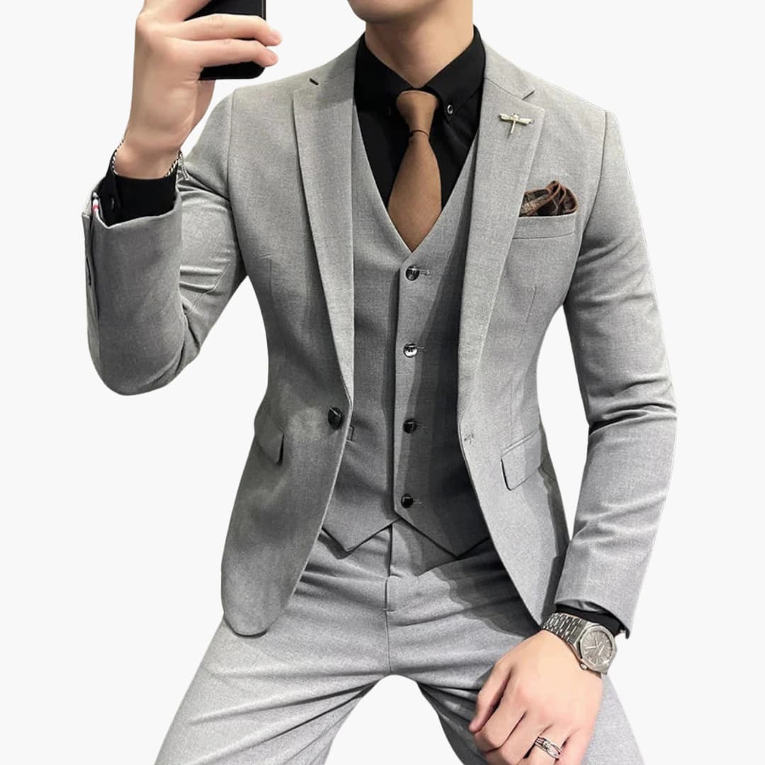 Dieser Herrenanzug besteht aus einem leichten, atmungsaktiven Material und eignet sich für den ganzjährigen Einsatz. Er umfasst ein langärmliges Sakko mit Knopfleiste, eine passende Weste und eine klassische Anzughose. Die schmale Passform und das Revers mit Kerbe machen ihn geeignet für Business- und formelle Anlässe.