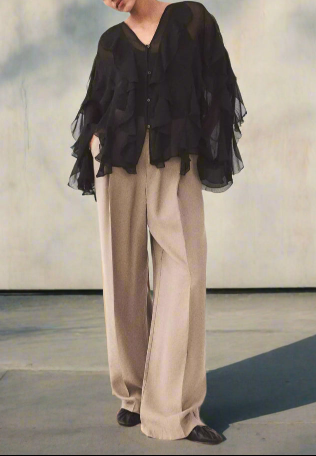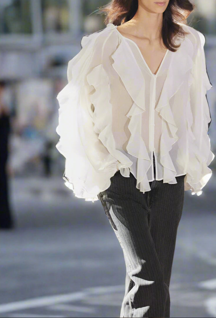 • Ausschnitt: Femininer V-Ausschnitt mit Rüschendetails