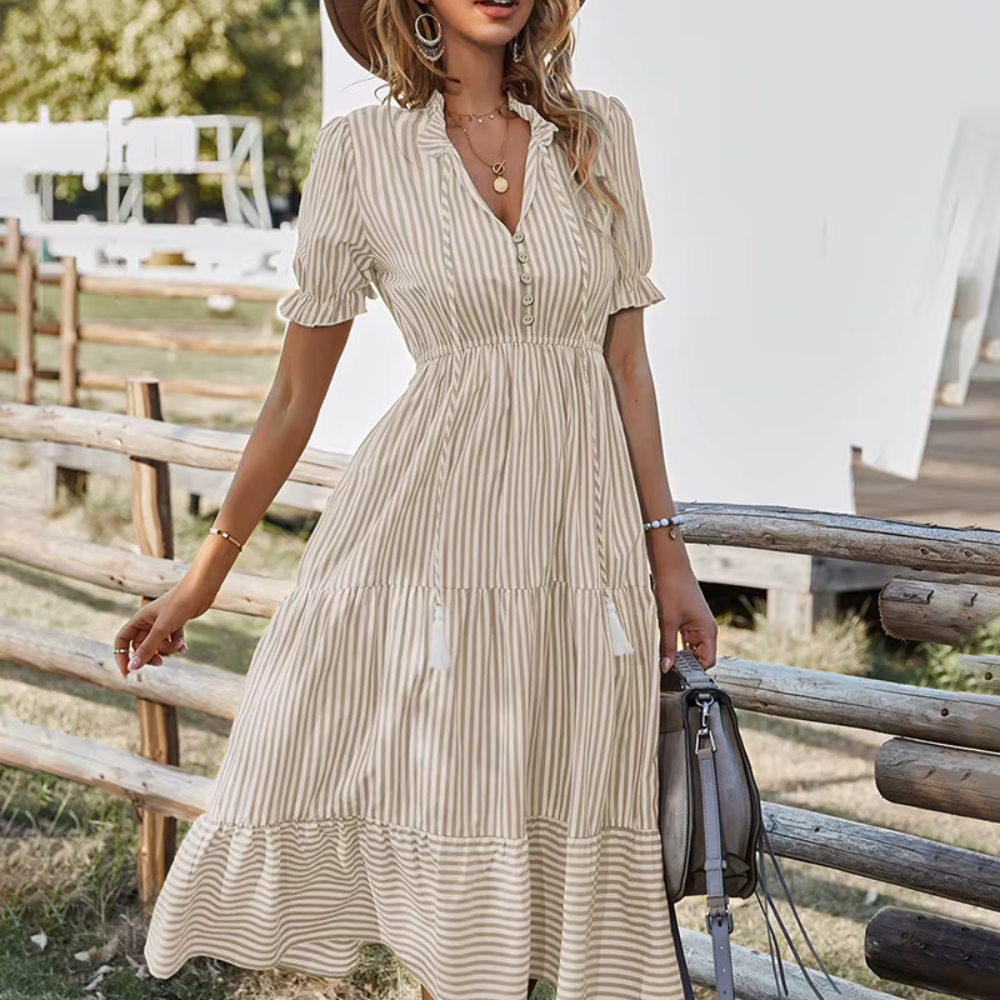 Verliebe dich in den boho-inspirierten Charme dieses leichten, gestreiften Kleids! Perfekt für Sommertage, Gartenpartys oder einen entspannten Stadtbummel, vereint es Eleganz und Komfort in einem einzigartigen Design.