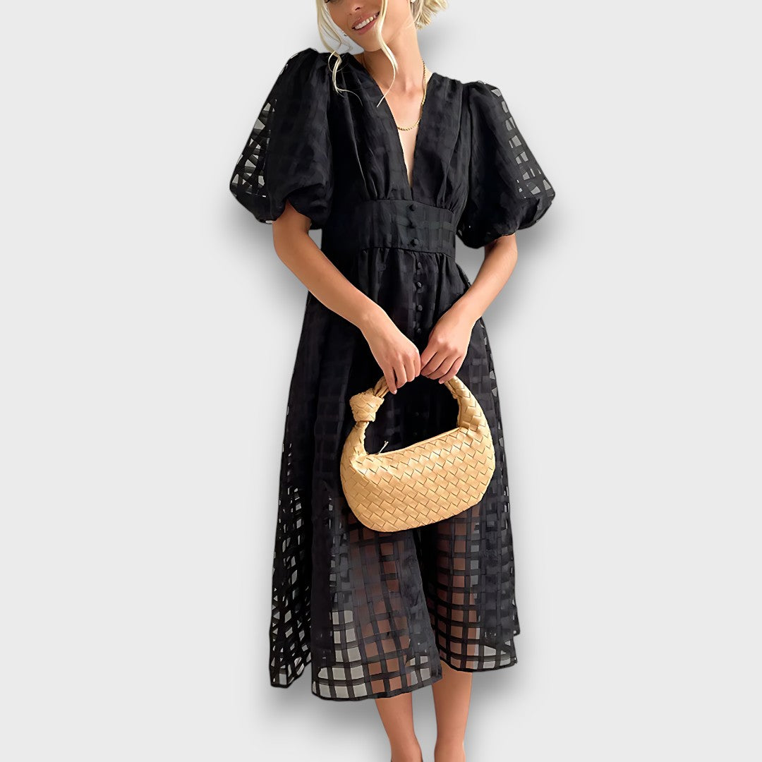 Lianora spielt mit Licht und Linien – ihr halbtransparenter Stoff in geometrischem Gitterdesign umhüllt dich mit Leichtigkeit und Eleganz. Die taillierte Silhouette und die ausgestellte Midilänge schaffen eine perfekte Balance zwischen modernem Chic und romantischer Verspieltheit. Ideal für sonnige Anlässe, Gartenfeste oder stilvolle Abende im Freien.