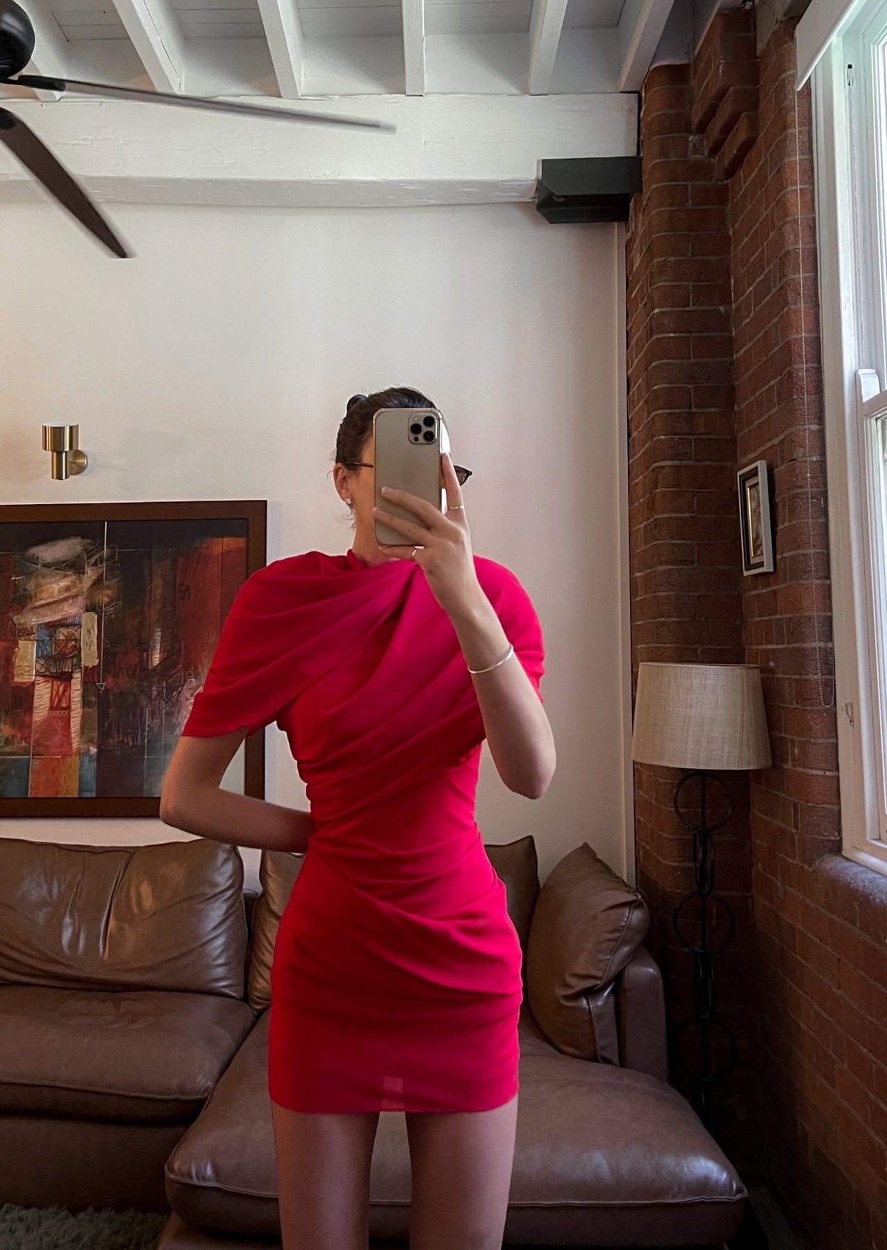 Dieses elegante Kleid ist ein Statement, das Luxus und Raffinesse ausstrahlt. Die schönen Drapierungen betonen die Silhouette und schaffen einen fließenden, skulpturalen Look. Die körpernahe Passform wirkt schmeichelhaft und betont die weiblichen Formen auf subtile und stilvolle Weise. Dieses Kleid eignet sich perfekt für einen Abend oder einen besonderen Anlass und ist für alle gedacht, die sich selbstbewusst und stilvoll fühlen wollen.