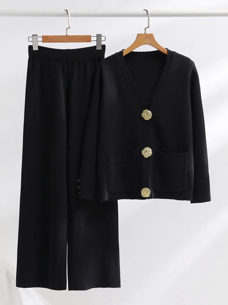 Exquisite Einzelheiten: Das Setz ist mit wunderschönen goldfarbenen Knöpfen versehen, die einen Hauch von Raffinesse und Eleganz verleihen. Die tiefen Taschen an der Strickjacke sind sowohl stilvoll als auch funktional und halten Ihre wichtigsten Utensilien griffbereit. Dezente Rippstrickbündchen sorgen für Struktur und unterstreichen den Gesamteindruck.