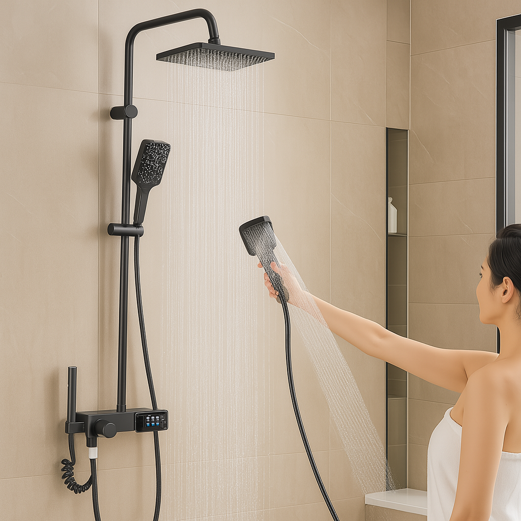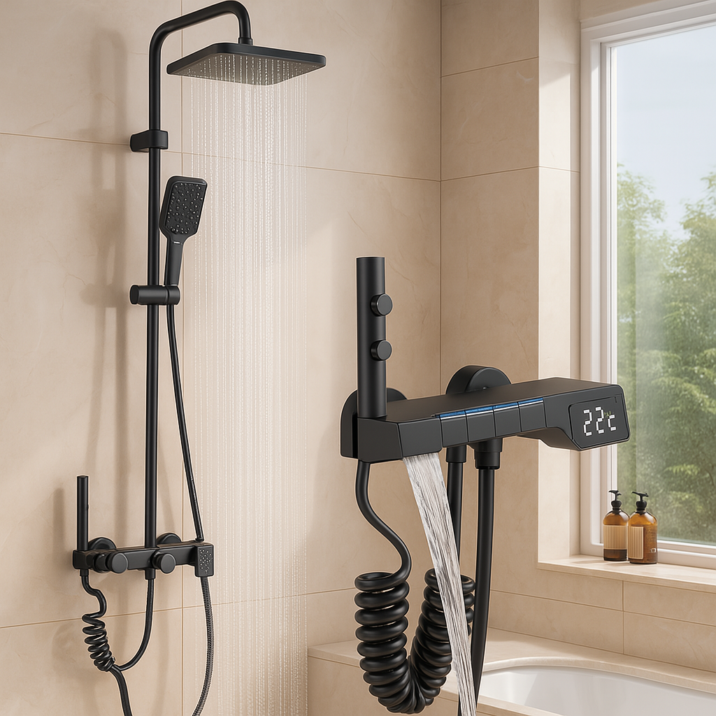 Das integrierte Messing-Bedienfeld bietet eine zuverlässige Temperaturregelung. Die Kombination aus Badewanne und Dusche spart Platz und verleiht dem Raum einen klaren, zeitgemäßen Look.