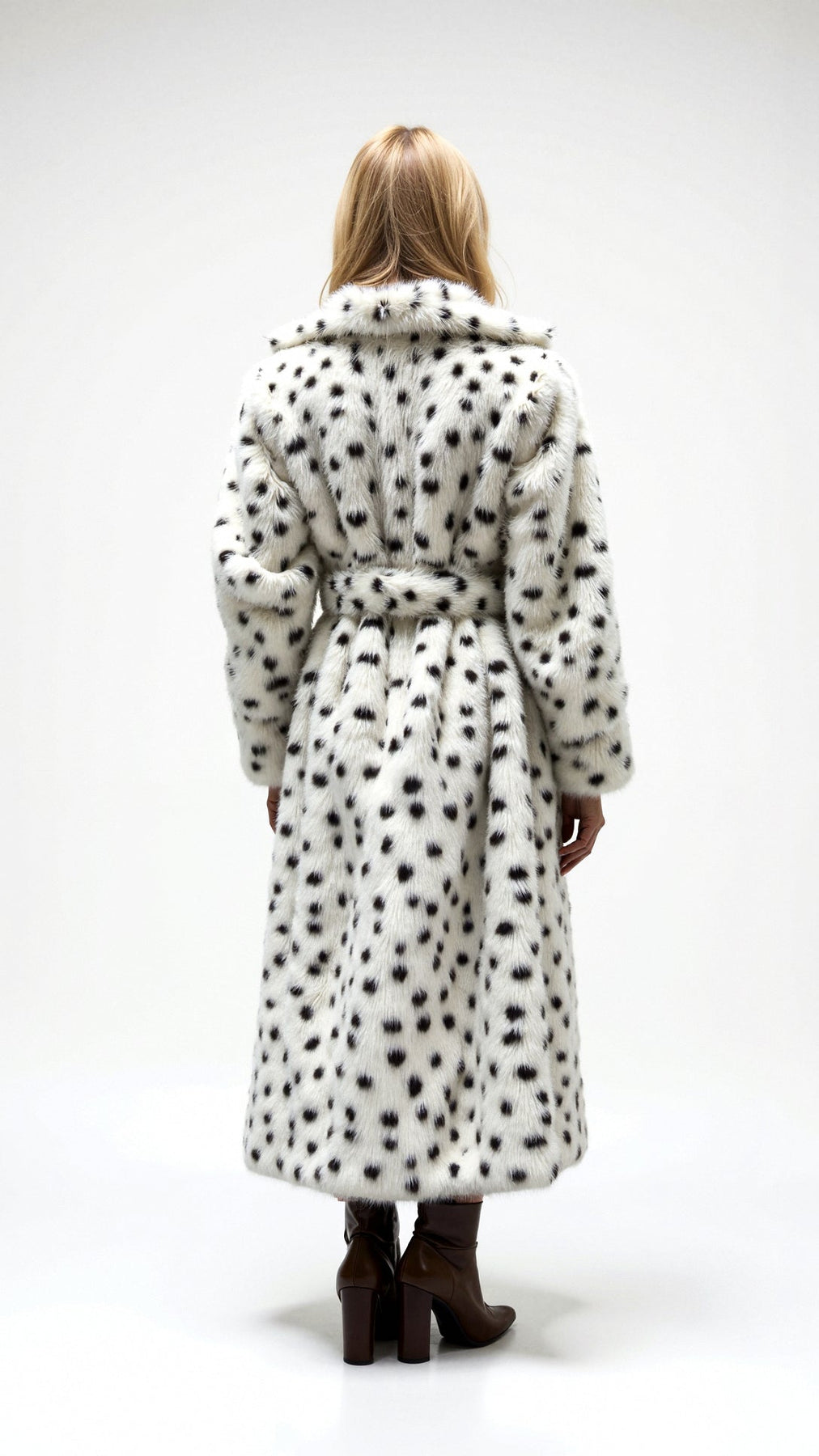Der Mantel „Morgana“ ist puren Glamour. Dieses atemberaubende Stück besticht durch plüschigen Kunstpelz im wilden Schneeleoparden-Print, während der übergroße Kragen und die dramatische Länge pure Kino-Attitüde verleihen. Die üppige Textur und die entspannte Silhouette beweisen, dass Luxus mühelos sein kann.