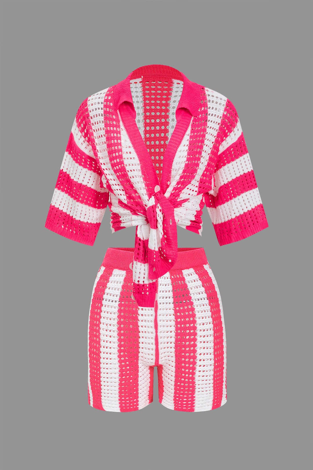 Das Noemi Zweiteiler-Set kombiniert verspielte Eleganz mit lässigem Boho-Charme. Das gehäkelte Material mit trendigem Streifenmuster sorgt für eine luftige und leichte Passform – perfekt für sommerliche Tage, Strandspaziergänge oder Festivals. Das geknotete Oberteil verleiht dem Look eine raffinierte Note, während die passenden Shorts für einen bequemen Sitz und maximale Bewegungsfreiheit sorgen.