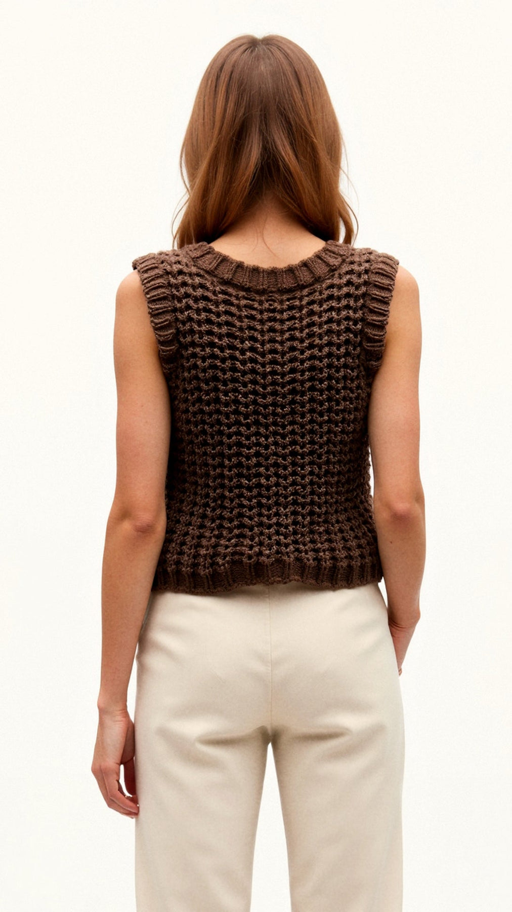 Die Weste „Philomena“ ist eine Neuinterpretation des traditionellen Charmes. Dieses stoffliche Highlight besticht durch ein dreidimensionales Rippenmuster und einen Stehkragen. Übergroße Goldknöpfe verleihen ihm einen Vintage-Look. Die verkürzte Silhouette und die klassischen Designelemente beweisen, dass traditionelle Techniken moderne Magie schaffen.