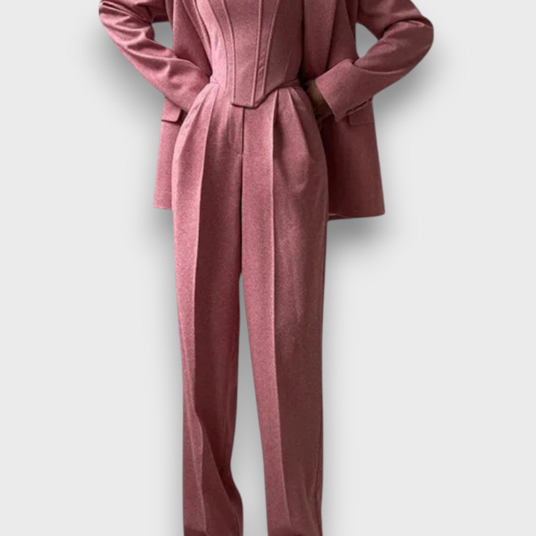 Stilvoller Dreiteiler – Hose, Blazer und Bustier für maximale Vielseitigkeit.