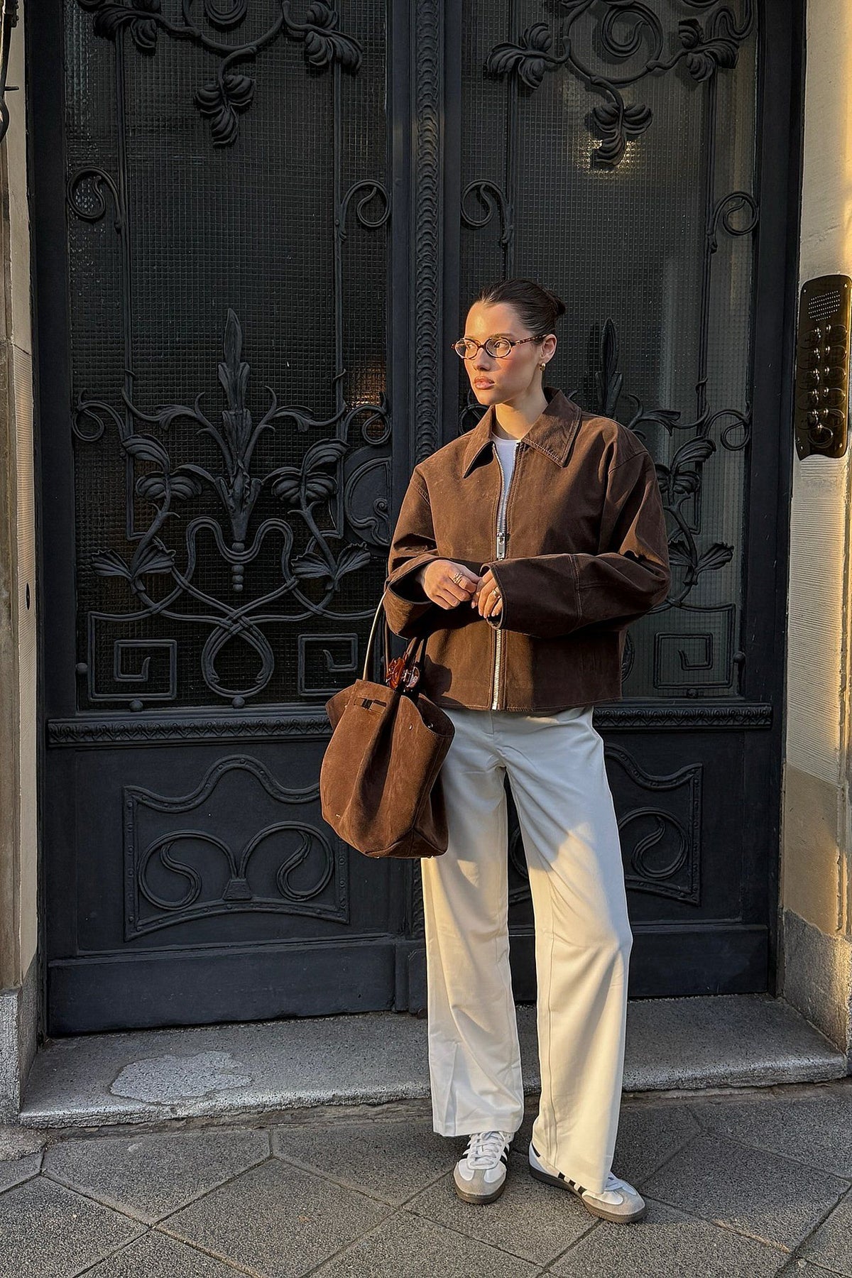 Diese strukturierte braune jacke verkörpert einen minimalistischen stil mit einem modernen siehe. der kurze, gerade schnitt, der spitze kragen und der schlichte reißverschluss machen sie zum perfekten layering-teil über einem strickkleid oder einer eng anliegenden hose. sie ist vielseitig und elegant zugleich und wertet jedes alltägliche outfit sofort auf.