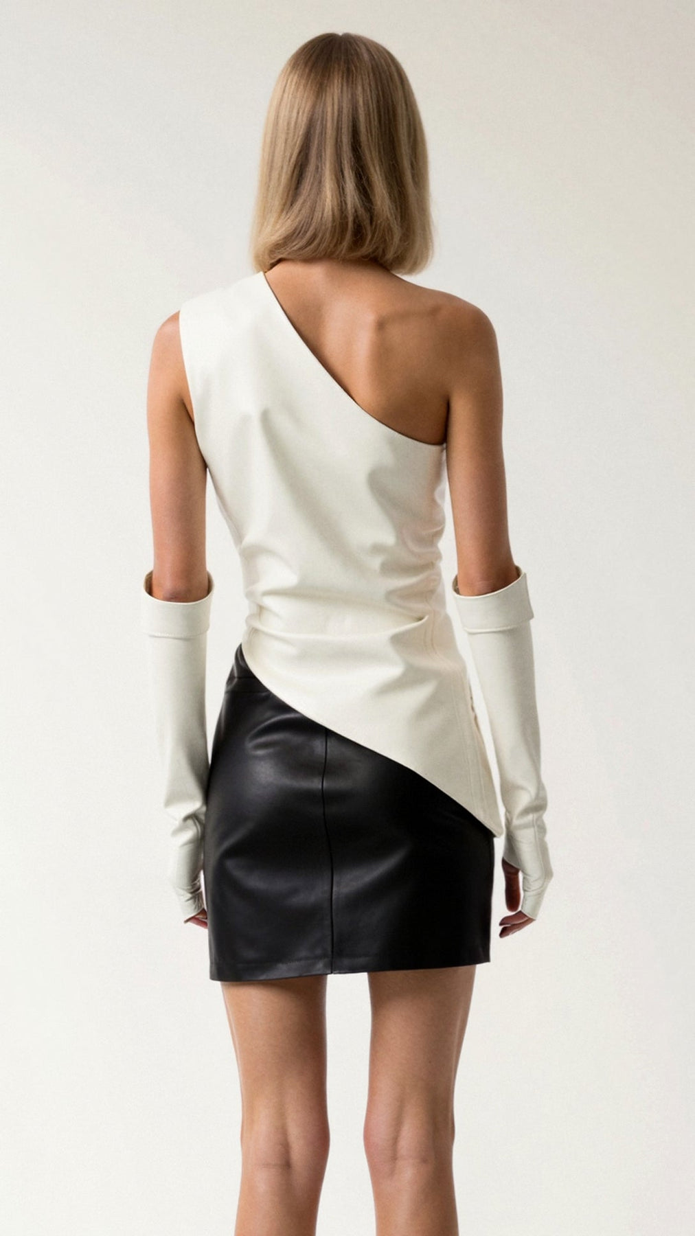 Das „Ulyssa“-Top verkörpert leidenschaftliche Eleganz. Dieses Statement-Stück aus luxuriösem Kunstleder mit architektonischem One-Shoulder-Design zieht alle Blicke auf sich. Der asymmetrische Saum sorgt für dramatische Winkel, während die passenden Opernhandschuhe Ihrem Look das gewisse Extra verleihen.