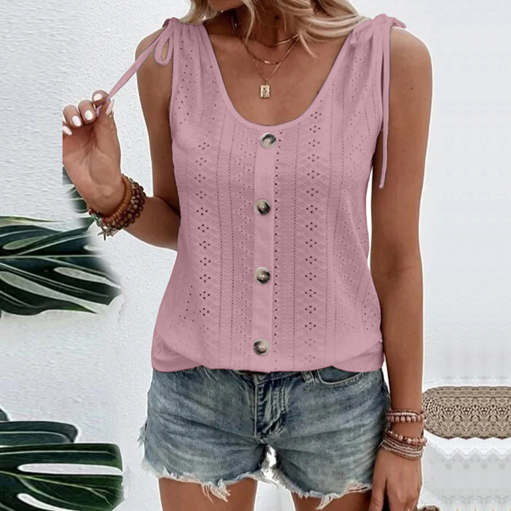 Die feine Lochstickerei lässt Ihre Haut atmen und sorgt gleichzeitig für einen Hauch Raffinesse. Soléa ist das ideale Oberteil für heiße Tage – angenehm zu tragen, stilvoll und mühelos kombinierbar.