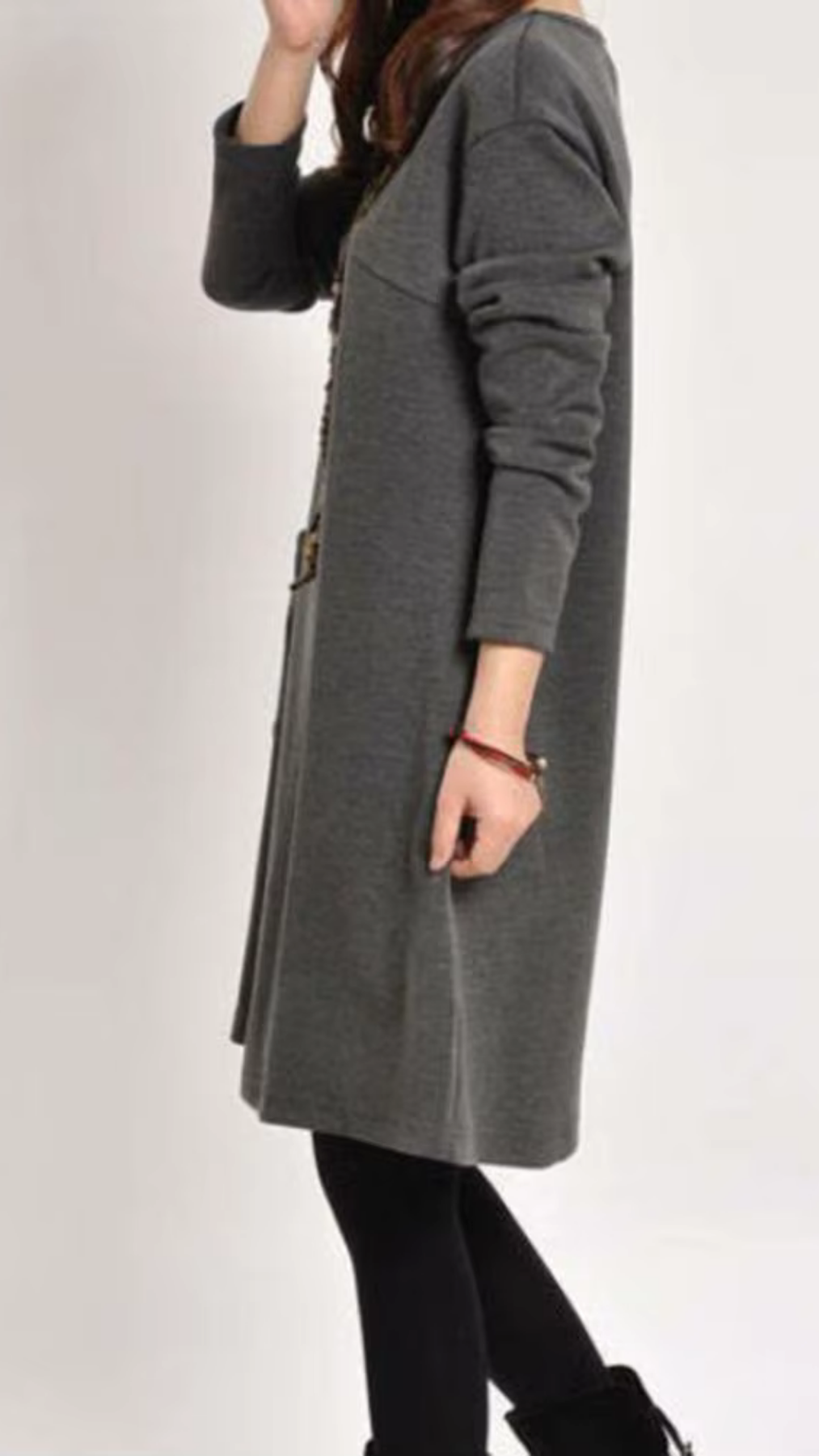 Dieses bequeme und stilvolle Kleid ist perfekt für einen entspannten Tag. Mit seinem lockeren Schnitt und der weichen Textur vereint es Komfort und Eleganz.