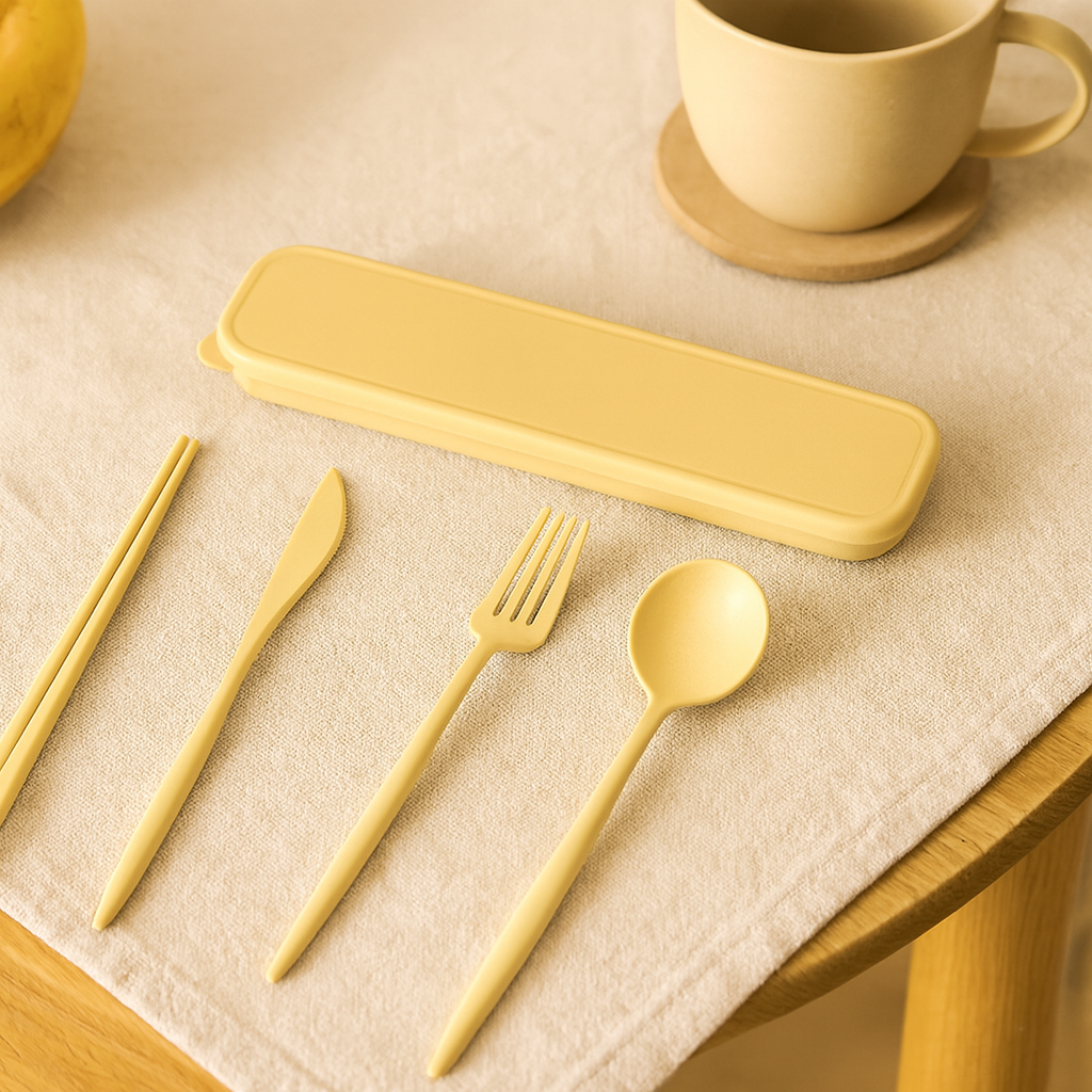 Mach jede Mahlzeit unterwegs schöner mit dem TerraGo | Reiseutensilien-Set. Dieses kompakte Besteckset bringt Komfort und Stil beim Campen, Picknick oder Reisen. Mit dem eleganten Aufbewahrungsetui hast du alles jederzeit griffbereit.